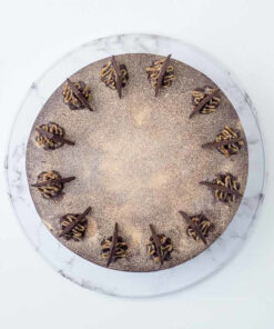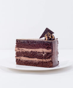 Moist chocolate cake brushed with espresso, drizzled with salted gula Melaka and chocolate mousseline.