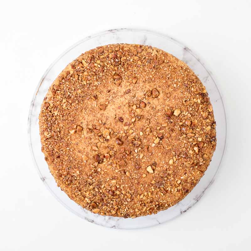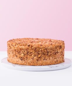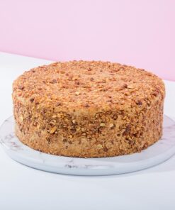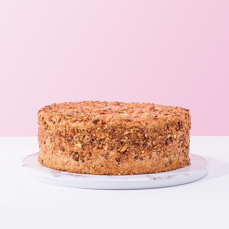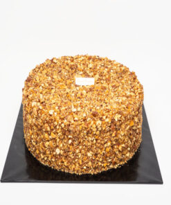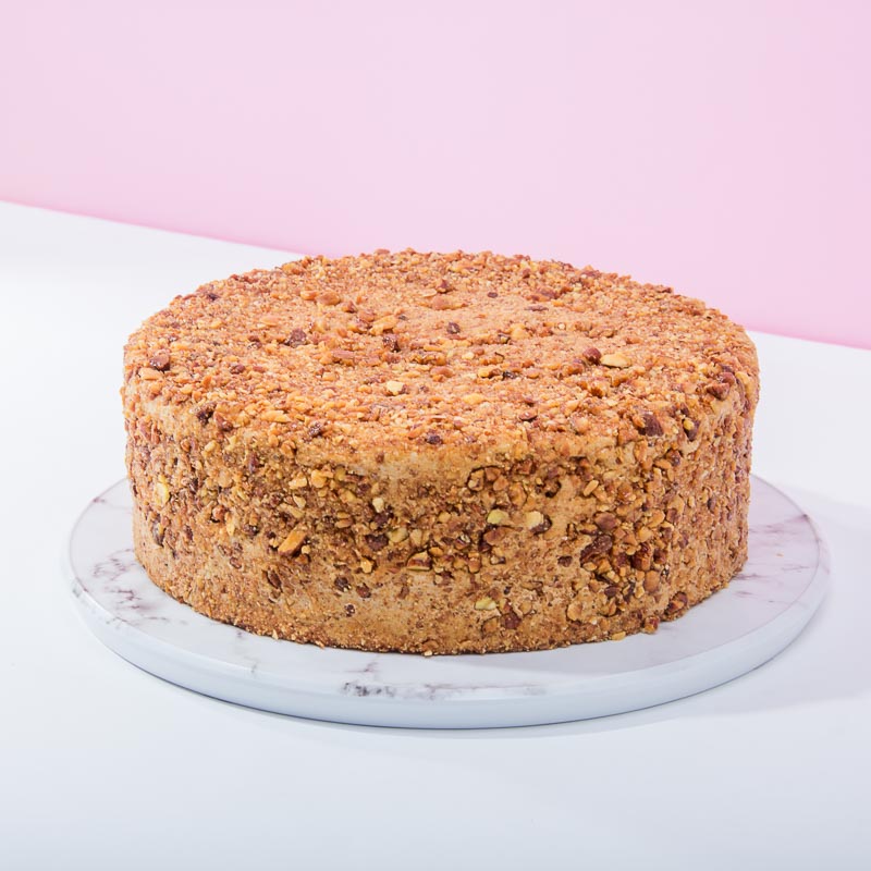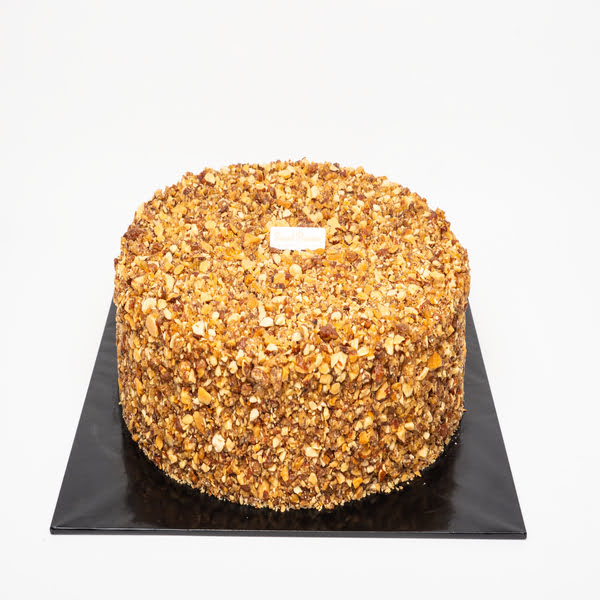 A light vanilla sponge soaked in rich espresso, layered with smooth mascarpone cream, and fully coated in golden caramelized almonds for a delicate crunch.